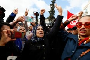 Demonstrators gesture during a protest against Tunisian President Kais Saied, on the anniversary of the 2011 uprising, in Tunis, Tunisia January 14, 2023. REUTERS/Zoubeir Souissi