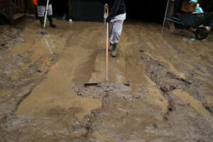 Neighbors clean a driveway after the San Lorenzo river flooded Felton Grove, California, U.S., January 14, 2023. REUTERS/David Swanson