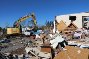 A man clears debris with a bulldozer after a tornado ripped through the property of Daryle and Shawna Littleton, in Prattville, Alabama, U.S., January 14, 2023. REUTERS/Evan Garcia