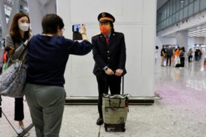 A passenger dressed as train driver poses for a picture at West Kowloon High-Speed Train Station Terminus on the first day of the resumption of rail service to mainland China, during the coronavirus disease (COVID-19) pandemic in Hong Kong, China, January 15, 2023. REUTERS/Tyrone Siu
