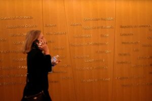FILE PHOTO: An attendee navigates the headquarters of the International Monetary Fund during the group’s Annual Meetings in Washington, U.S., October 13, 2022. REUTERS/James Lawler Duggan/File Photo