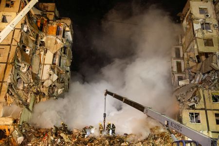 DNIPRO/KYIV (Reuters) – Russia unleashed a new wave of major attacks on Ukraine on Saturday, hitting energy infrastructure across the country and killing at least 12 people in a missile strike on a nine-storey apartment building in the city of Dnipro, officials said.