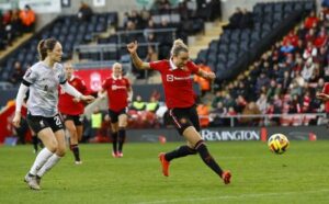 Soccer Football – Women’s Super League – Manchester United v Liverpool – Leigh Sports Village, Leigh, Britain – January 15, 2023 Manchester United’s Martha Thomas scores their fifth goal Action Images via Reuters/Andrew Boyers
