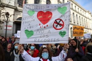 Health workers protest against the public health care policy of the Madrid regional government, which they say is destroying primary care, in Madrid, Spain, January 15, 2023. The banner reads “Health care bleeds. Ayuso (Madrid regional president Isabel Diaz Ayuso) listen to Madrid. No to the cuts.” REUTERS/Isabel Infantes