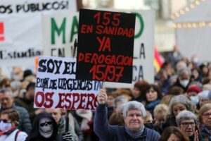 Health workers and their supporters protest against the public health care policy of the Madrid regional government, which they say is destroying primary care, in Madrid, Spain, January 15, 2023. REUTERS/Isabel Infantes