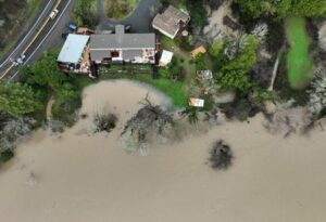 Floodwater from the Russian River approaches homes following a chain of winter storms, in Guerneville, California, U.S. January 15, 2023. REUTERS/Fred Greaves