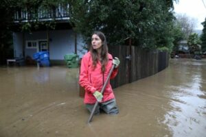 Melissa Foley clears debris and helps in her neighborhood as the San Lorenzo River rises with emergency evacuation orders in Felton Grove, California, U.S., January 14, 2023. REUTERS/David Swanson