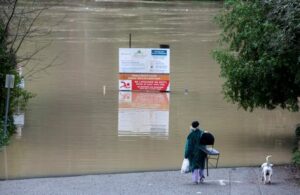 Emily Jean Pierre and her dog Vixen walk near the Russian River where it flooded Johnson’s beach in Guerneville, California, U.S. January 15, 2023. REUTERS/Fred Greaves