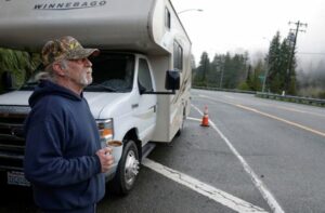 Evacuee Steve Summey drinks coffee next to his motorhome parked on the highway days after a chain of winter storms forced him to leave his property in Guerneville, California, U.S. January 15, 2023. REUTERS/Fred Greaves