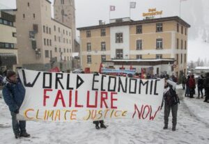 Climate activists display a banner during a protest ahead of the World Economic Forum (WEF) 2023 in the Alpine resort of Davos, Switzerland, January 15, 2023. REUTERS/Arnd Wiegmann