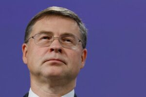 FILE PHOTO: European Commission Executive Vice President Valdis Dombrovskis attends a news conference after a meeting of the College of European Commissioners in Brussels, Belgium November 9, 2022. REUTERS/Yves Herman