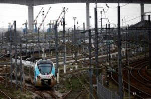 FILE PHOTO: A SNCF regional train is seen at a railway station in Nantes, as France’s trade unions announced a nationwide day of strike and protests next week against planned pension reform, France, January 13, 2023. REUTERS/Stephane Mahe/File Photo