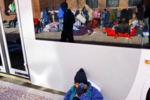 Migrants, mostly from Venezuela, rest outside a shelter after a visit by New York City Mayor Eric Adams, who discussed immigration with local authorities in El Paso, Texas, U.S., January 15, 2023. REUTERS/Jose Luis Gonzalez