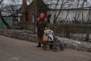 Una mujer empuja un cochecito cargado con un saco de carbón para calentar su casa, en medio del ataque de Rusia a Ucrania, en el pueblo de Nykyforivka, región de Donetsk, Ucrania, 15 de enero de 2023. REUTERS/Oleksandr Ratushniak