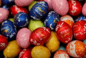 FILE PHOTO: Lindor chocolate eggs of Swiss chocolatier Lindt & Spruengli are displayed during the annual news conference in Kilchberg, Switzerland March 3, 2020. REUTERS/Arnd Wiegmann