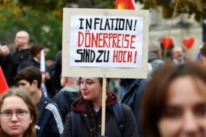 ARCHIV: Ein Demonstrantin hält ein Schild mit der Aufschrift “Inflation! Dönerpreise sind zu hoch!” während einer Demonstration für die Energieunabhängigkeit von Russland in Berlin, Berlin, Deutschland, 22. Oktober, 2022. REUTERS/Christian Mang