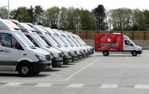 FILE PHOTO: Delivery vans lined up prior to dispatch at the Ocado CFC (Customer Fulfilment Centre) in Andover, Britain May 1, 2018. REUTERS/Peter Nicholls