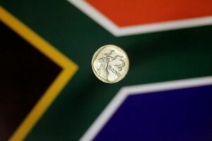 Illustration photo of South African rand January 17, 2023 January 17, 2023 Illustration photo shows a two-rand coin above a South African flag April 12, 2017. REUTERS/Thomas White/Illustration