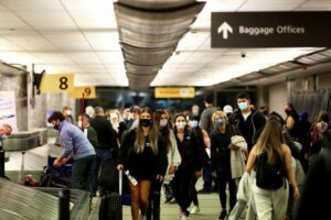 FILE PHOTO: Travelers wearing protective face masks to prevent the spread of the coronavirus disease (COVID-19) reclaim their luggage at the airport in Denver, Colorado, U.S., November 24, 2020. REUTERS/Kevin Mohatt/File Photo