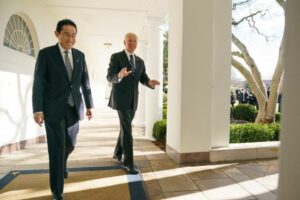 FILE PHOTO: U.S. President Joe Biden and Japanese Prime Minister Fumio Kishida walk through the colonnade of the White House on their way to the Oval Office, in Washington, U.S., January 13, 2023. Mandel Ngan/Pool via REUTERS
