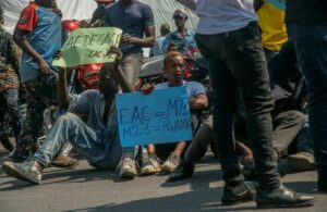 Congolese demonstrators hold placards denouncing the East African Community (EAC), which set up a regional military force last year to end rebel-driven unrest, within Goma in the North Kivu province of the Democratic Republic of Congo January 18, 2023. REUTERS/Djaffar Sabiti