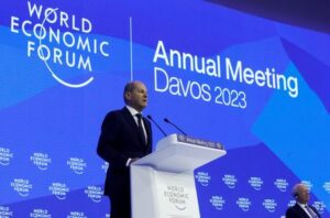 German Chancellor Olaf Scholz addresses the World Economic Forum (WEF), next to World Economic Forum (WEF) founder and Executive Chairman Klaus Schwab, in Davos, Switzerland, January 18, 2023. REUTERS/Arnd Wiegmann