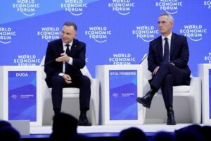 NATO Secretary General Jens Stoltenberg and Poland’s President Andrzej Duda take part in World Economic Forum session on “Restoring Security and Peace.”, in Davos, Switzerland, January 18, 2023. REUTERS/Arnd Wiegmann