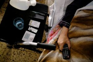Jose Maria Casais, 69, who has the flu, rests in his bed before trying to sleep, as he uses a portable oxygen concentrator respiratory machine connected to electricity to breathe, in Barcelona, Spain, December 12, 2022. REUTERS/Nacho Doce