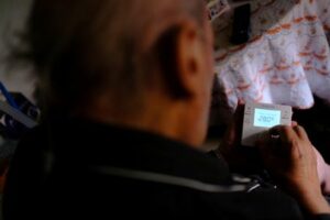 Jose Maria Casais, 69, uses a device to turn the heating up during a bout of flu, as he sits on a wheelchair in his house in Barcelona, Spain, December 8, 2022. REUTERS/Nacho Doce