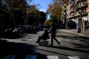 Alvaro, 40, a caregiver, pushes the wheelchair of his client Jose Maria Casais, 69, who is using a portable oxygen concentrator backpack with a battery to breathe, as they cross the road in Barcelona, Spain, December 9, 2022. REUTERS/Nacho Doce