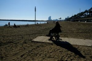 Jose Maria Casais, 69, uses a portable oxygen concentrator backpack with a battery to breathe as he sits at Barceloneta beach, in Barcelona, Spain, January 5, 2023. REUTERS/Nacho Doce
