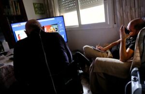 Alvaro, 40, a caregiver, talks with doctors over the phone about his client Jose Maria Casais, 69, who has the flu and uses nasal cannula to connect to a portable oxygen concentrator respiratory machine to breathe, in Casais’s house in Barcelona, Spain, December 22, 2022. REUTERS/Nacho Doce