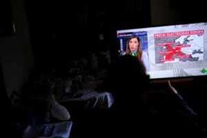 Jose Maria Casais, 69, breathes using a portable oxygen concentrator respiratory machine, which is connected to electricity up to 24 hours a day, as he watches a TV news program about the cost of electricity in Europew while sitting on a wheelchair in his house in Barcelona, Spain, December 9, 2022. REUTERS/Nacho Doce