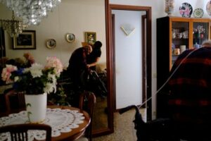 Alvaro, 40, a caregiver, helps to dress his client Jose Maria Casais, 69, who uses a nasal cannula connected to a portable oxygen concentrator respiratory machine to breathe, in Casais’s house in Barcelona, Spain, December 14, 2022. REUTERS/Nacho Doce