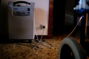 Un concentrador de oxígeno portátil en el interior del domicilio de Jose María Casais, de 69 años de edad, que precisa de conexión a la red eléctrica durante hasta 24 horas al día, en Barcelona, España, el 9 de diciembre de 2022. REUTERS/Nacho Doce