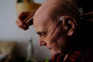 La cara de Jose María Casais, de 69 años de edad, quien precisa de una máquina de oxígeno portátil para respirar, muestra la marca dejada por una cánula nasal, mientras su cuidador Álvaro, de 40 años, lo ayuda a vestire en su domicilio en Barcelona, España, el 14 de diciembre de 2022. REUTERS/Nacho Doce