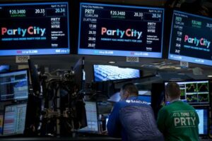 A Barclay’s Capital Specialist trader works at the post that trades Party City Holdco Inc. during the company’s IPO on the floor of the New York Stock Exchange April 16, 2015. REUTERS/Brendan McDermid