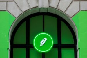 FILE PHOTO: The logo of Robinhood Markets, Inc. is seen at a pop-up event on Wall Street after the company’s IPO in New York City, U.S., July 29, 2021. REUTERS/Andrew Kelly