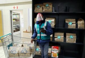 Albert Siwela, a delivery worker looks at his mobile before making an online delivery from a Checkers store, July 14, 2020. REUTERS/Siphiwe Sibeko