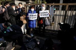 Yoshiko Furukawa (59) from Tomioka Town and Etsuko Kudo (68) from Aizu City, support group members of plaintiffs, show off banners reading “All innocent. Wrongful judgment” after the The Tokyo High Court upheld a not guilty verdict for former Tokyo Electric Power Company (TEPCO) executives of negligence over the 2011 Fukushima nuclear power station disaster, in front of the court in Tokyo, Japan, January 18, 2023. REUTERS/Issei Kato