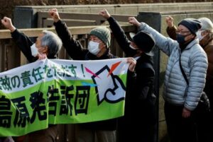 Support group members of plaintiffs raise their fists and shout slogans after the The Tokyo High Court upheld a not guilty verdict for former Tokyo Electric Power Company (TEPCO) executives of negligence over the 2011 Fukushima nuclear power station disaster, in front of the court in Tokyo, Japan, January 18, 2023. REUTERS/Issei Kato