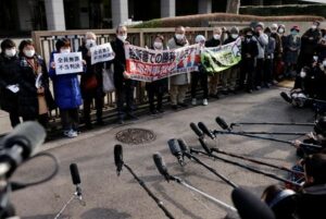 Support group members of plaintiffs show off banners reading “All innocent. Wrongful judgment” after the The Tokyo High Court upheld a not guilty verdict for former Tokyo Electric Power Company (TEPCO) executives of negligence over the 2011 Fukushima nuclear power station disaster, in front of the court in Tokyo, Japan, January 18, 2023. REUTERS/Issei Kato
