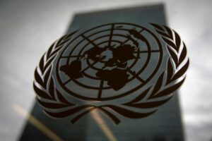 FILE PHOTO: The United Nations headquarters building is pictured though a window with the UN logo in the foreground in the Manhattan borough of New York August 15, 2014. REUTERS/Carlo Allegri (UNITED STATES)