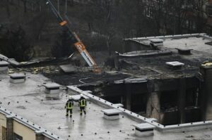 A general view of the site of a helicopter crash, amid Russia’s attack on Ukraine, in the town of Brovary, outside Kyiv, Ukraine, January 18, 2023. REUTERS/Viacheslav Ratynskyi