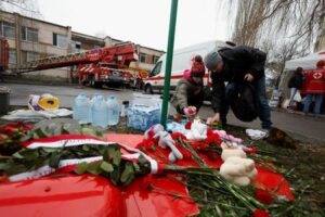 People leave tributes at the site of a helicopter crash, amid Russia’s attack on Ukraine, in the town of Brovary, outside Kyiv, Ukraine, January 18, 2023. REUTERS/Valentyn Ogirenko