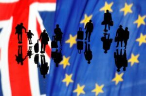 Small toy figures are seen in front of UK and European Union displayed flags in this illustration picture, October 17, 2019. REUTERS/Dado Ruvic/Illustration