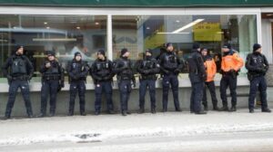 FILE PHOTO: The Ukraine House is reflected in a window of a shop as Swiss police officers stand in front, during the World Economic Forum (WEF) 2023, in the Alpine resort of Davos, Switzerland, January 16, 2023. REUTERS/Arnd Wiegmann/File Photo
