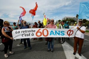 FILE PHOTO: Protestors hold a banner which reads “Retirement is at 60” during a demonstration as part of a nationwide day of strike and protests to push for government measures to address inflation, workers’ rights and pension reforms, in Nice, France, September 29, 2022. REUTERS/Eric Gaillard/File Photo
