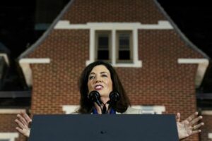 FILE PHOTO: New York Governor Kathy Hochul speaks during a campaign rally with other New York Democrats, in Yonkers, New York, U.S., November 6, 2022. REUTERS/Kevin Lamarque/File Photo