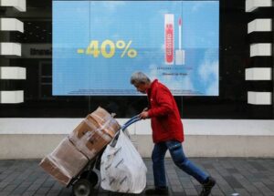 A man carrying parcels walks past a shop advertising sales January 19, 2023 January 19, 2023 A man carrying parcels walks past a shop advertising sales in Istanbul, Turkey, January 19, 2023. REUTERS/Dilara Senkaya